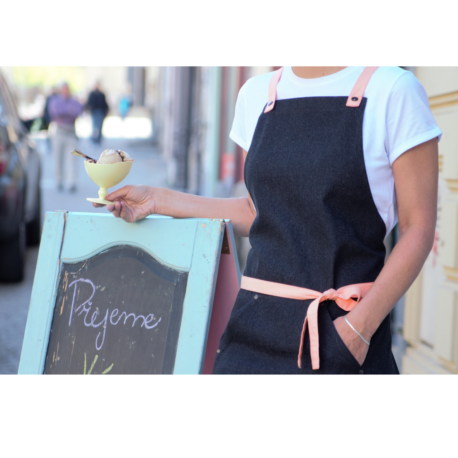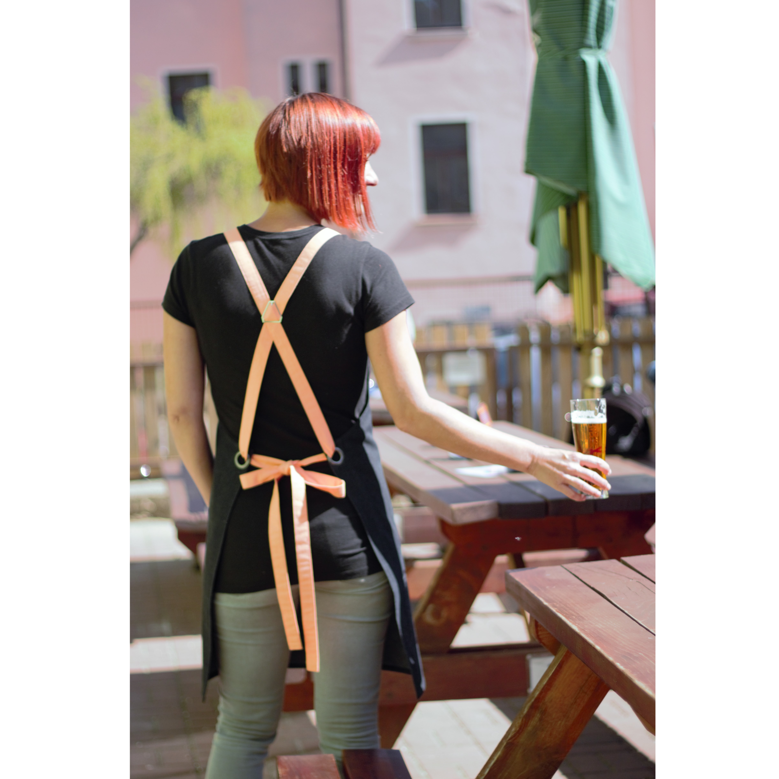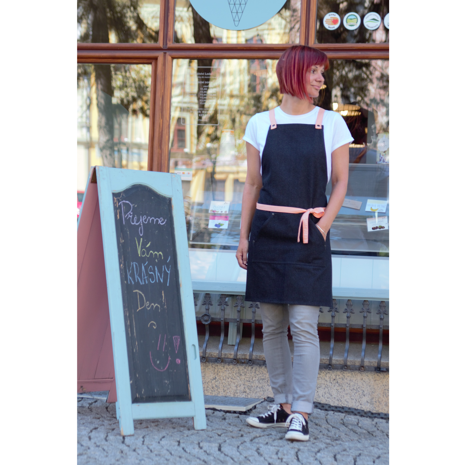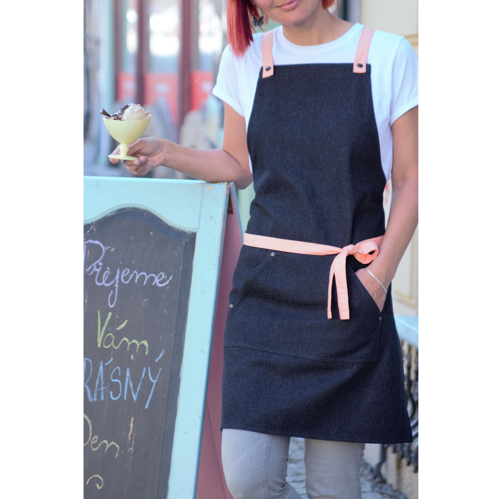 Simple yet stylish black denim apron. Choose the color of the straps that will best fits to your business.