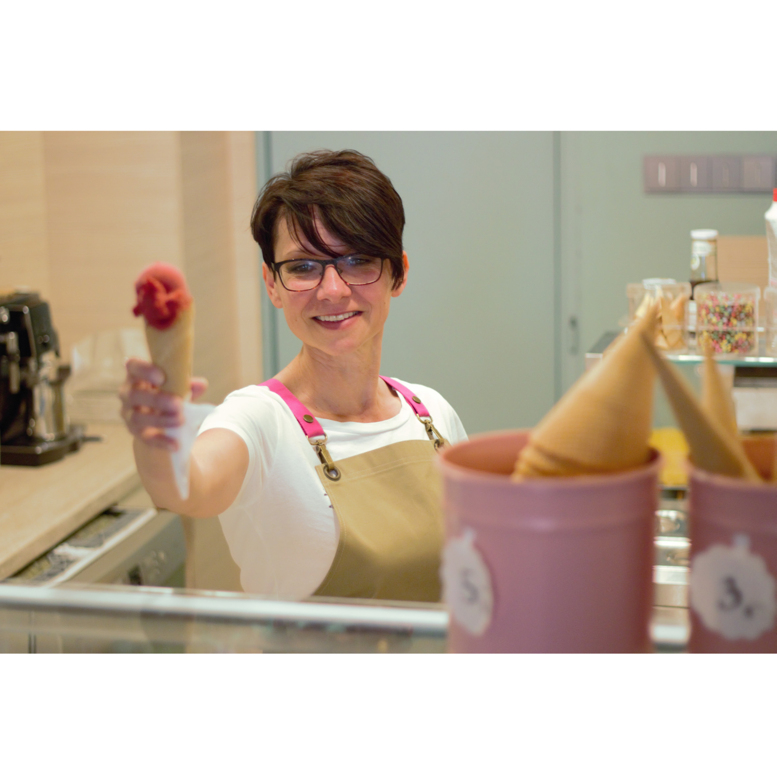 Beautiful and very practical beige apron with detachable carabiners. Choose the color of the straps that will best fits to your business.