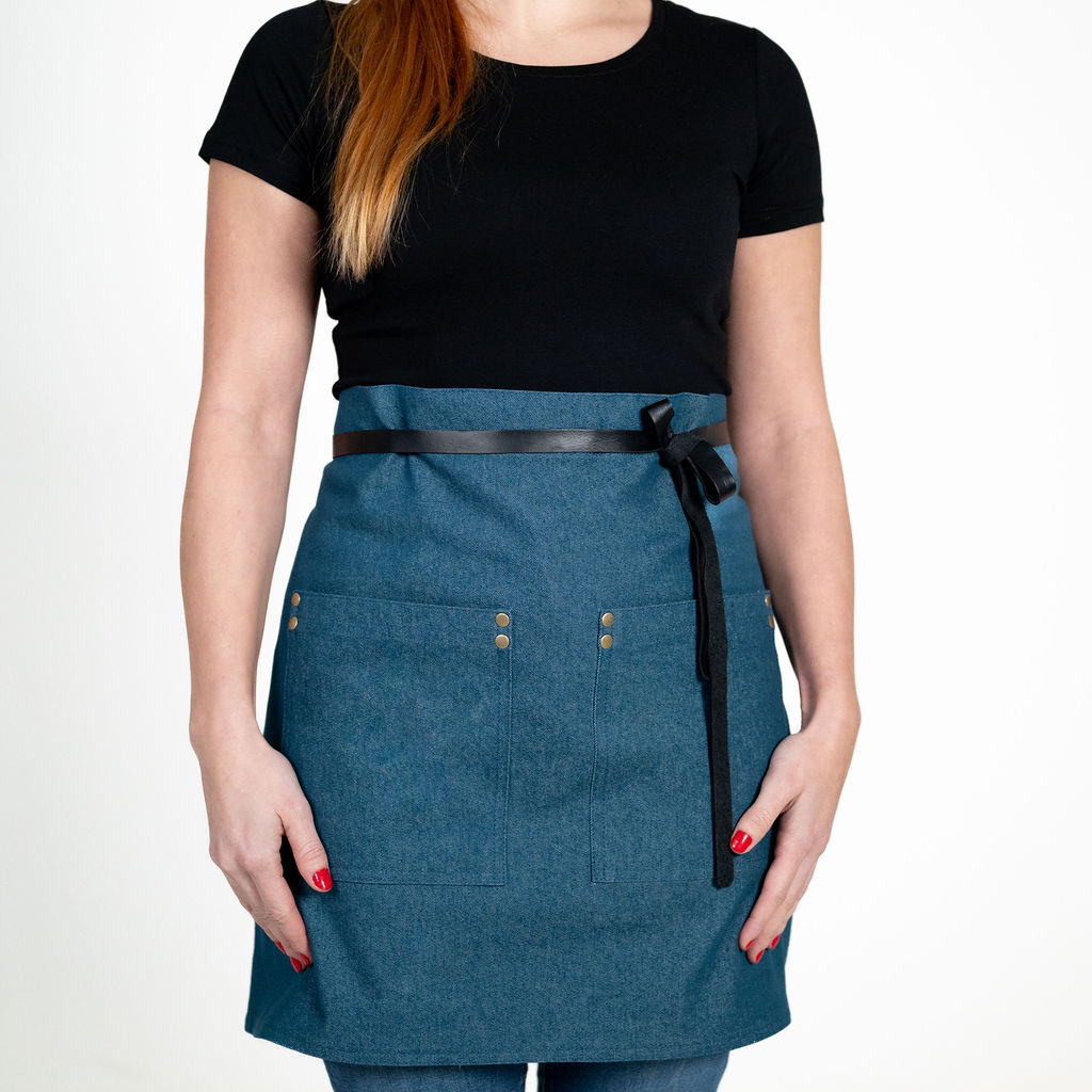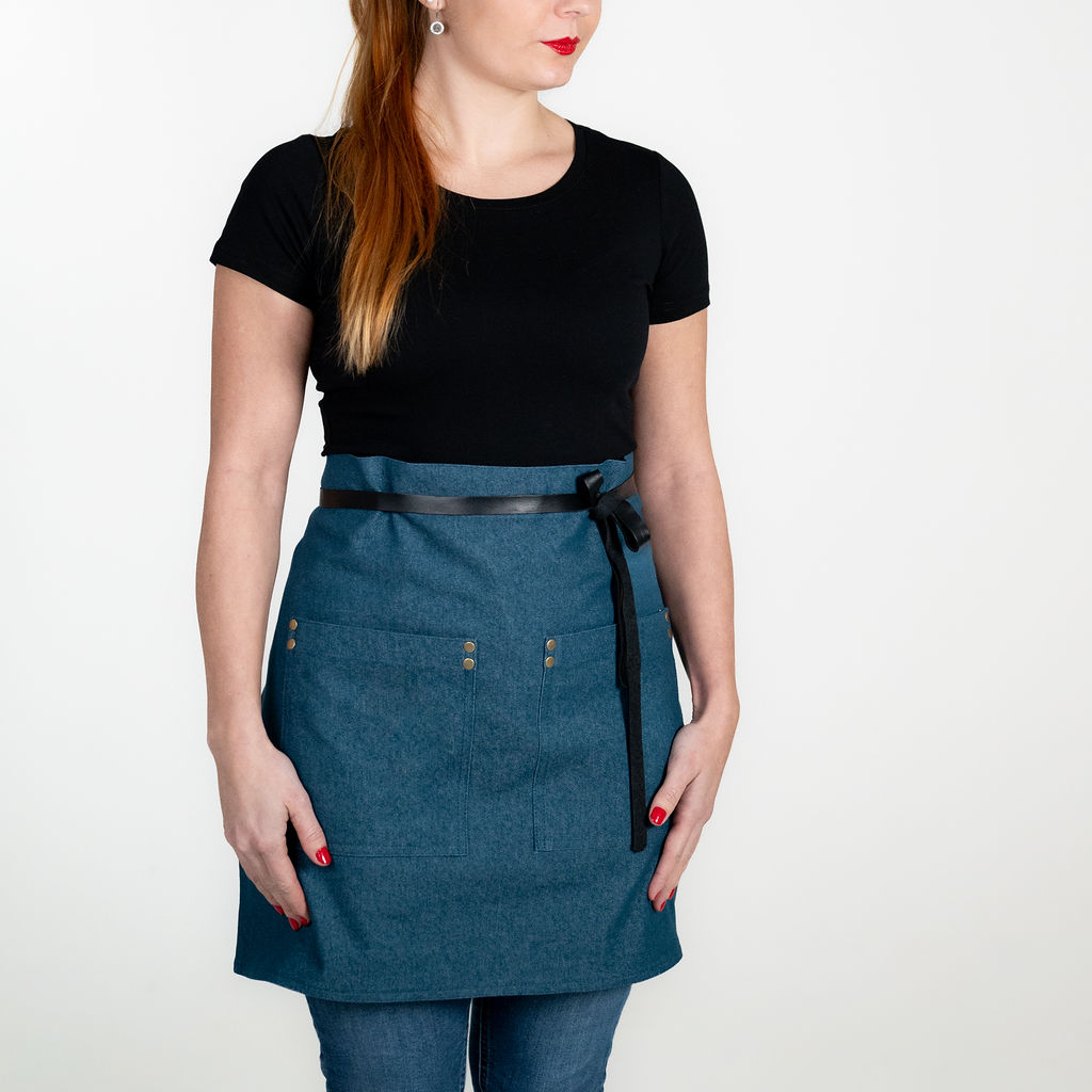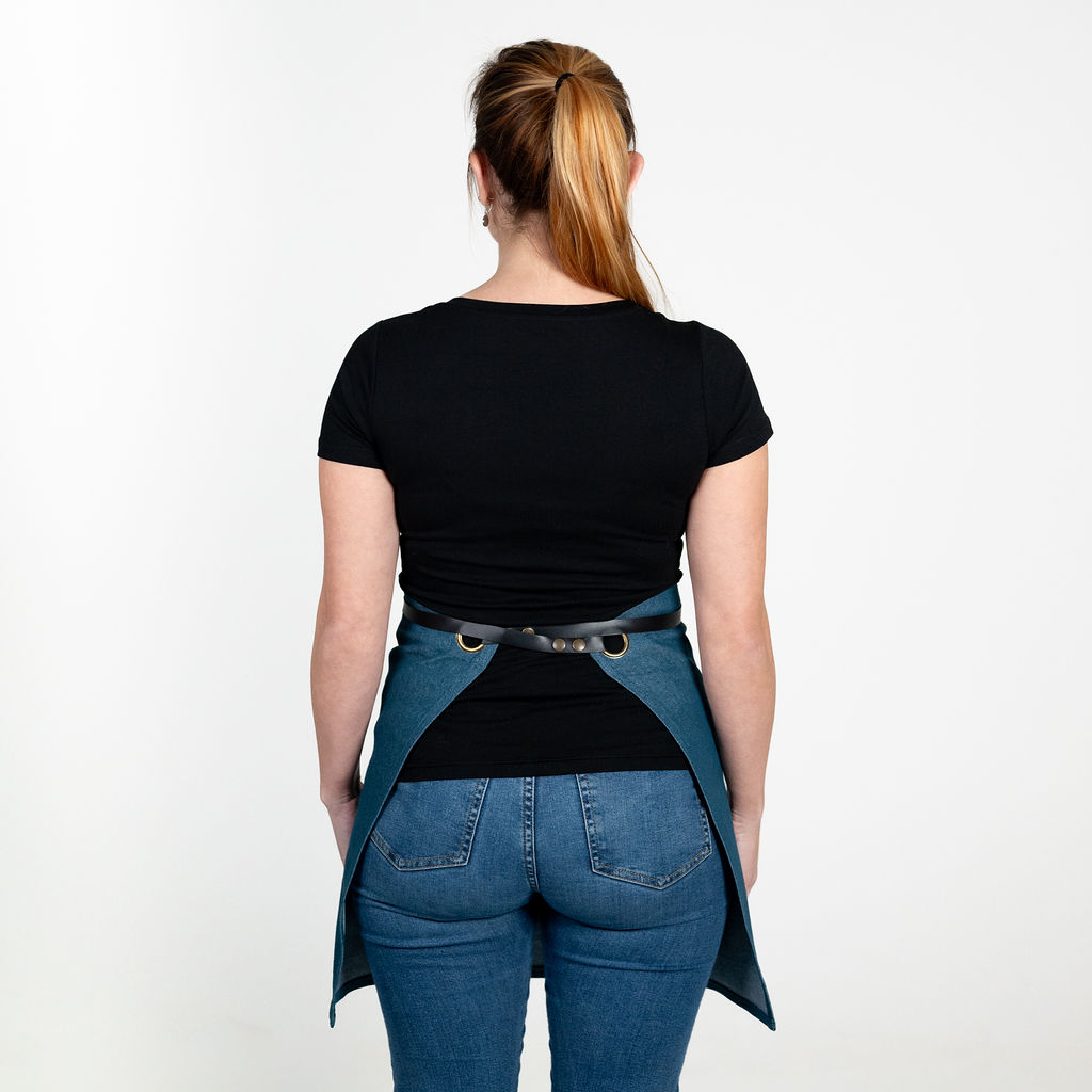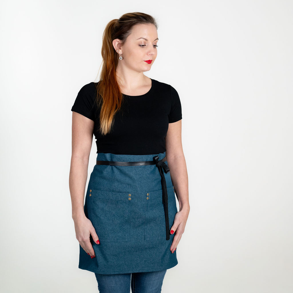 ZÁSTĚRA APRONISTA AXIS denim modrá petrolejová s černým koženým popruhem