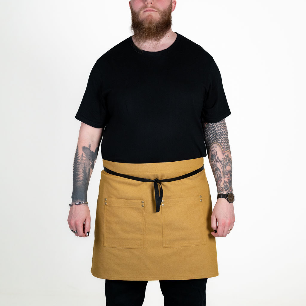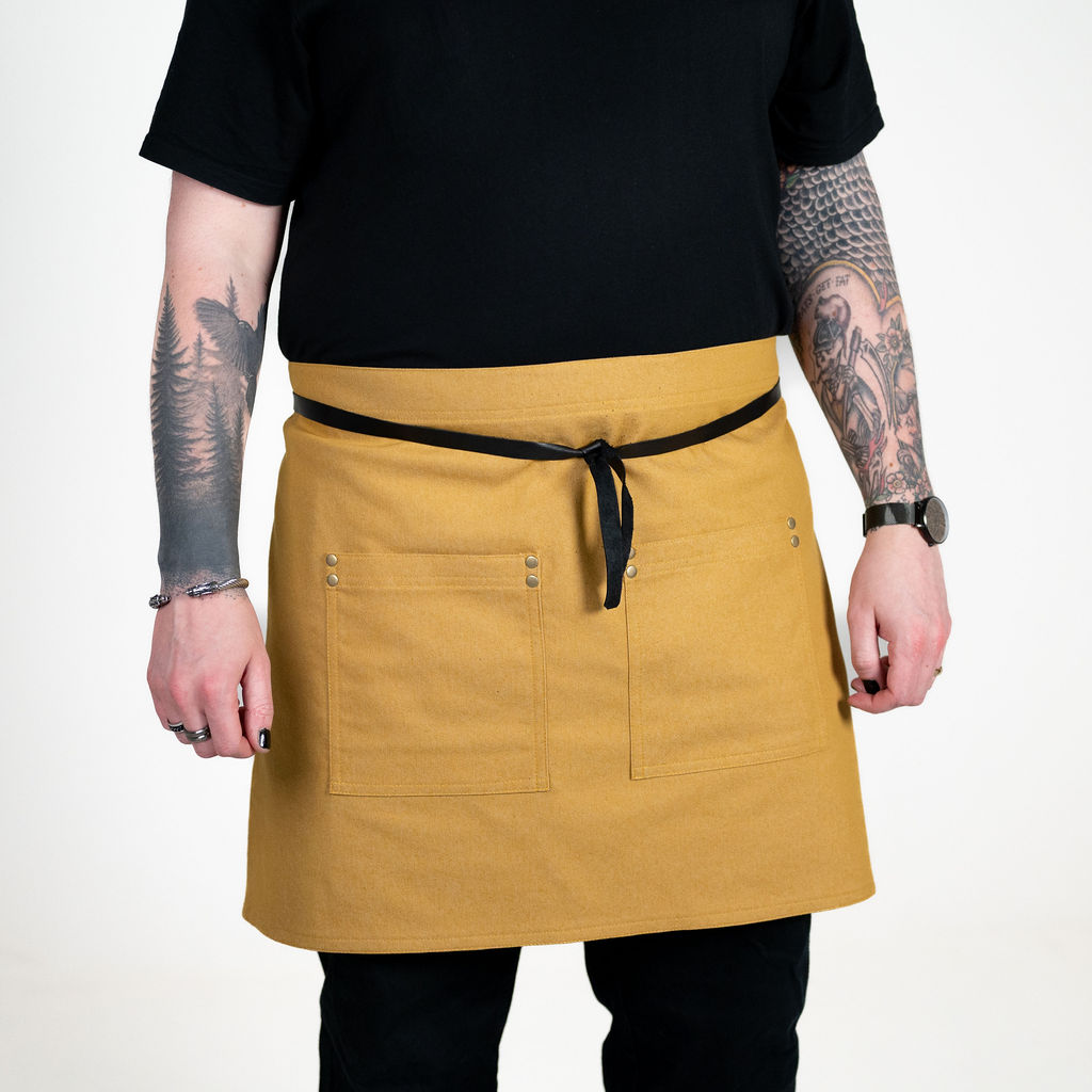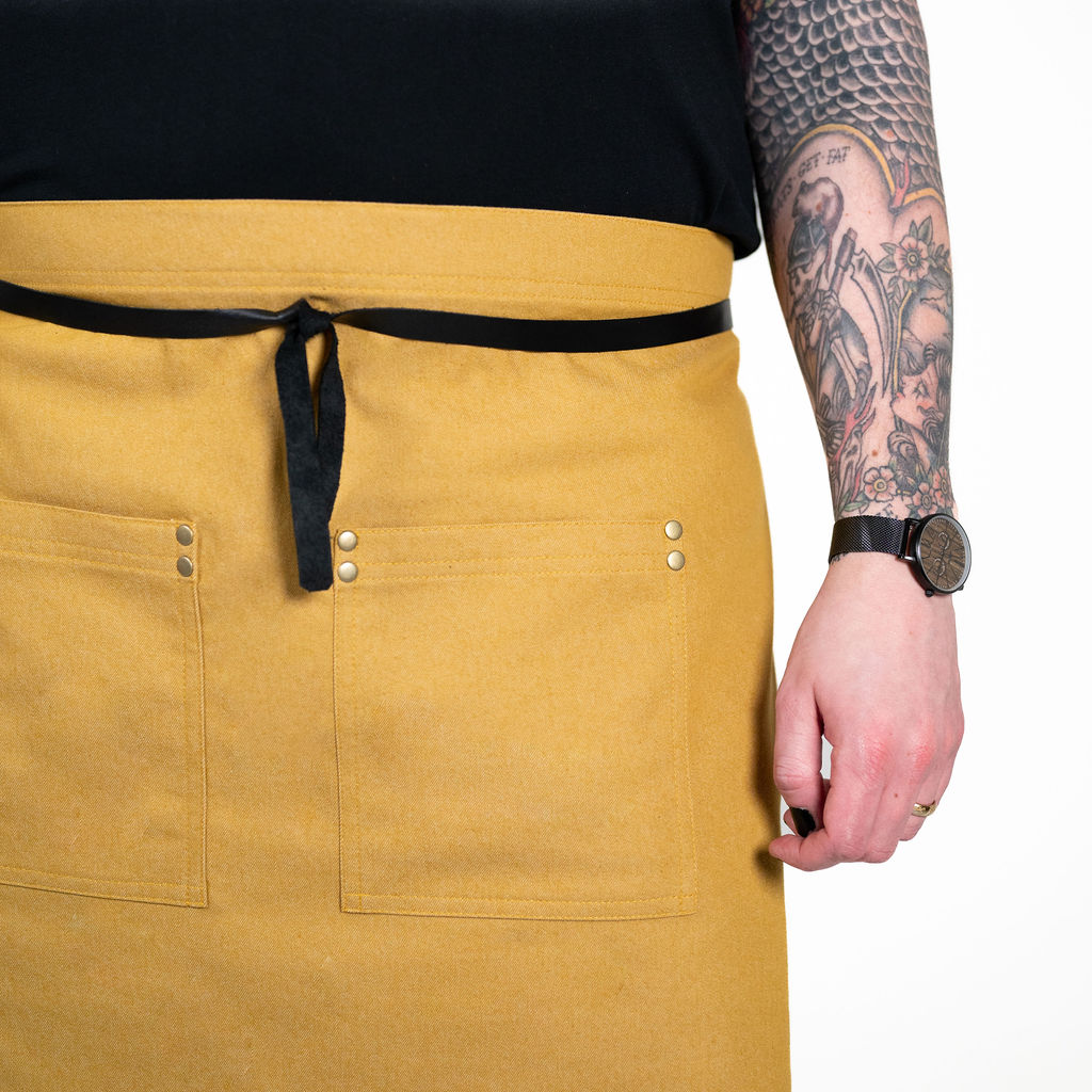 ZÁSTĚRA APRONISTA AXIS hořčicově žlutý denim s černými koženými popruhy