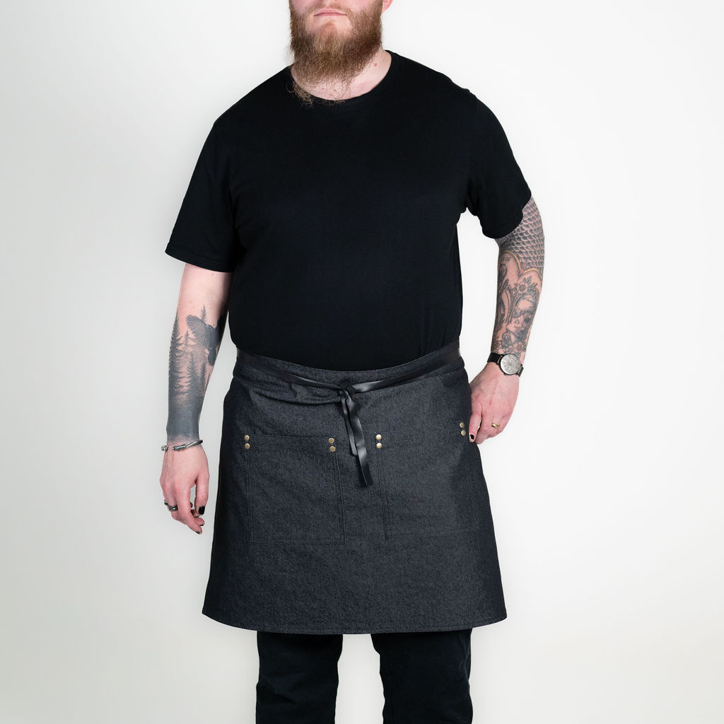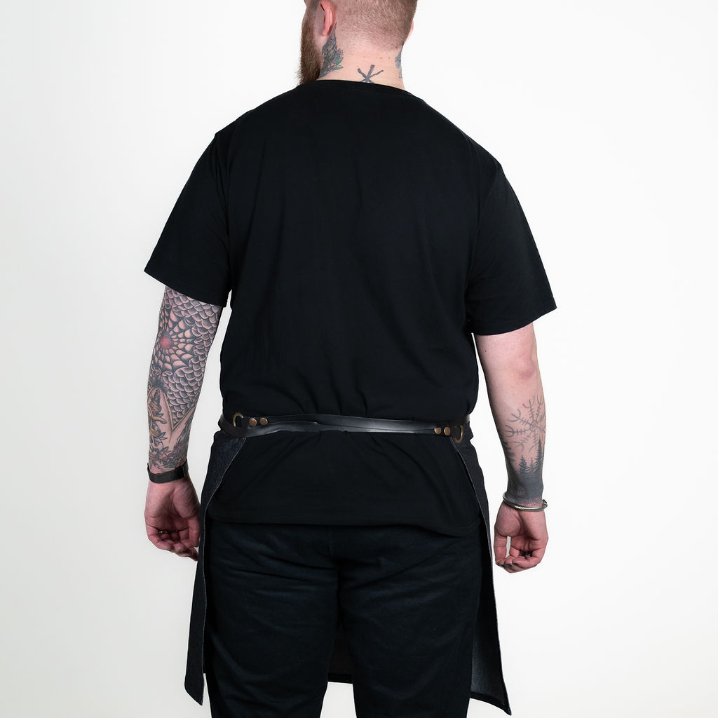ZÁSTĚRA APRONISTA AXIS černý denim s černými koženými popruhy