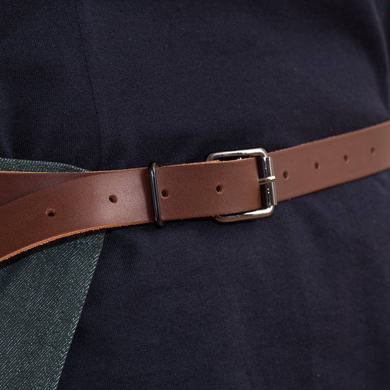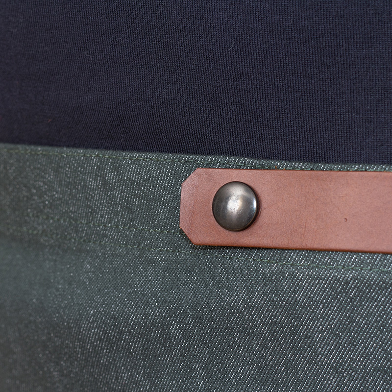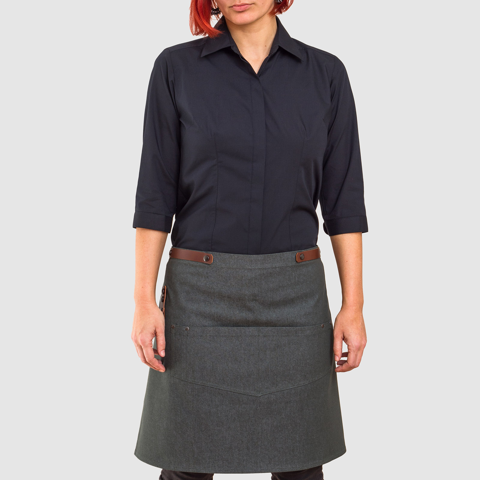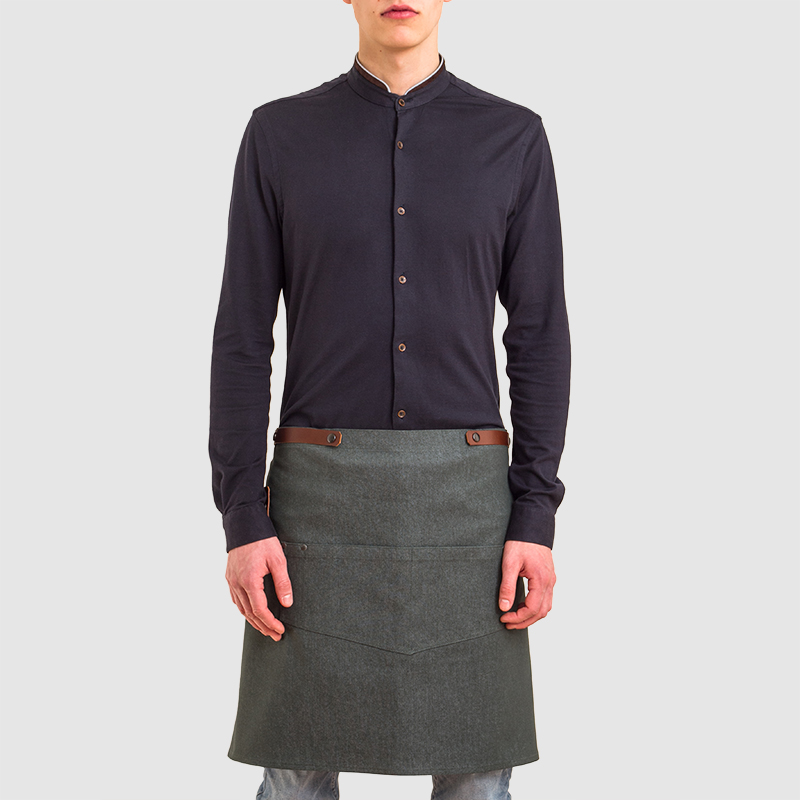 Short apron to the waist with variable fastening to the leather strap. Luxurious look and design. Large practical pocket divided into 4 parts, with ring carabiner on the side. We recommend for service or brigade.