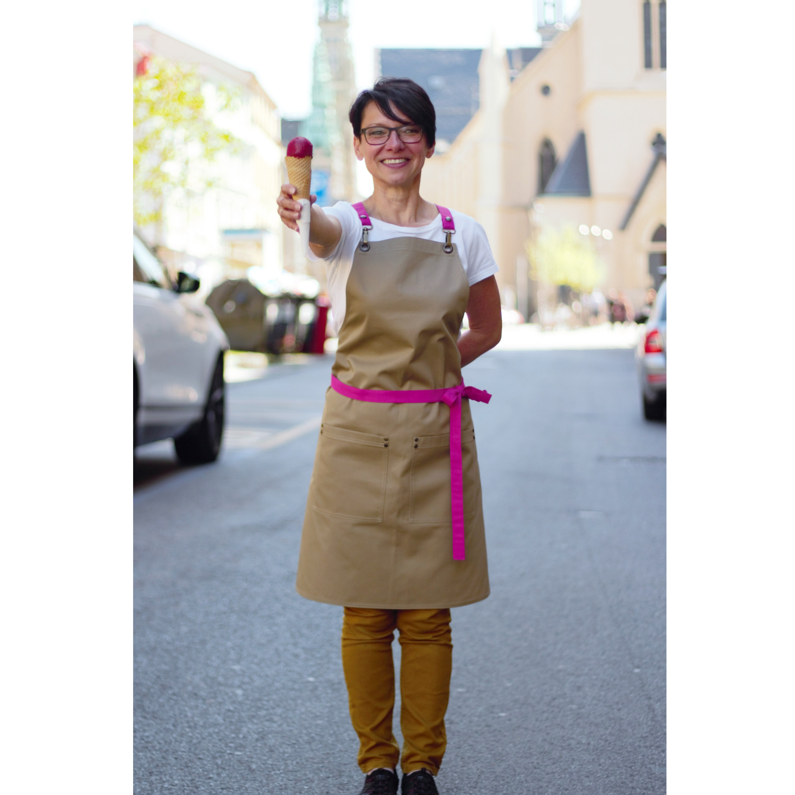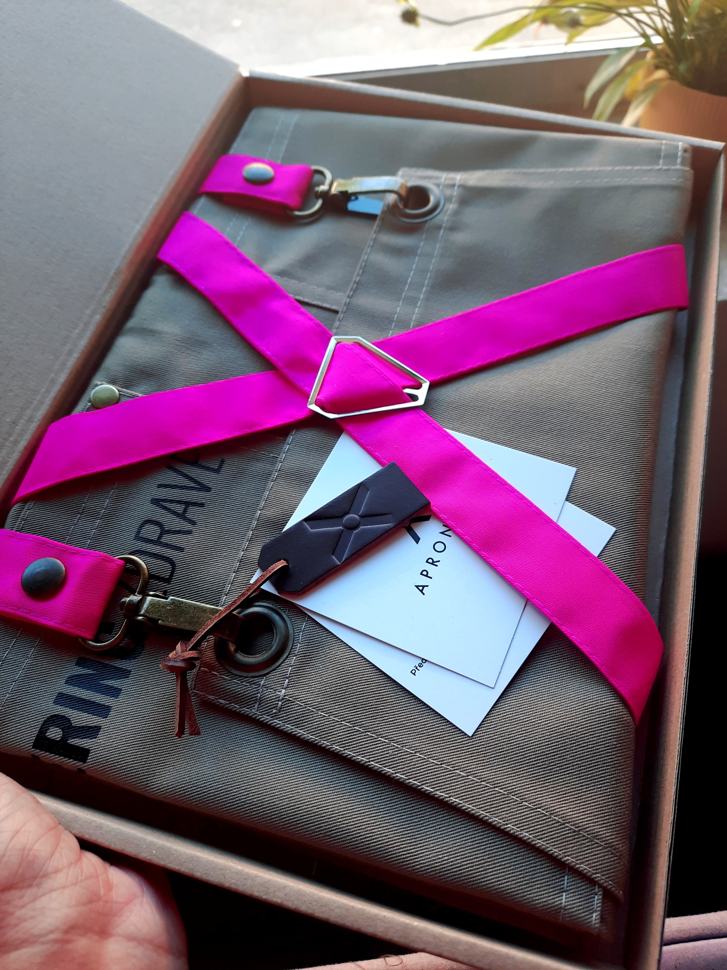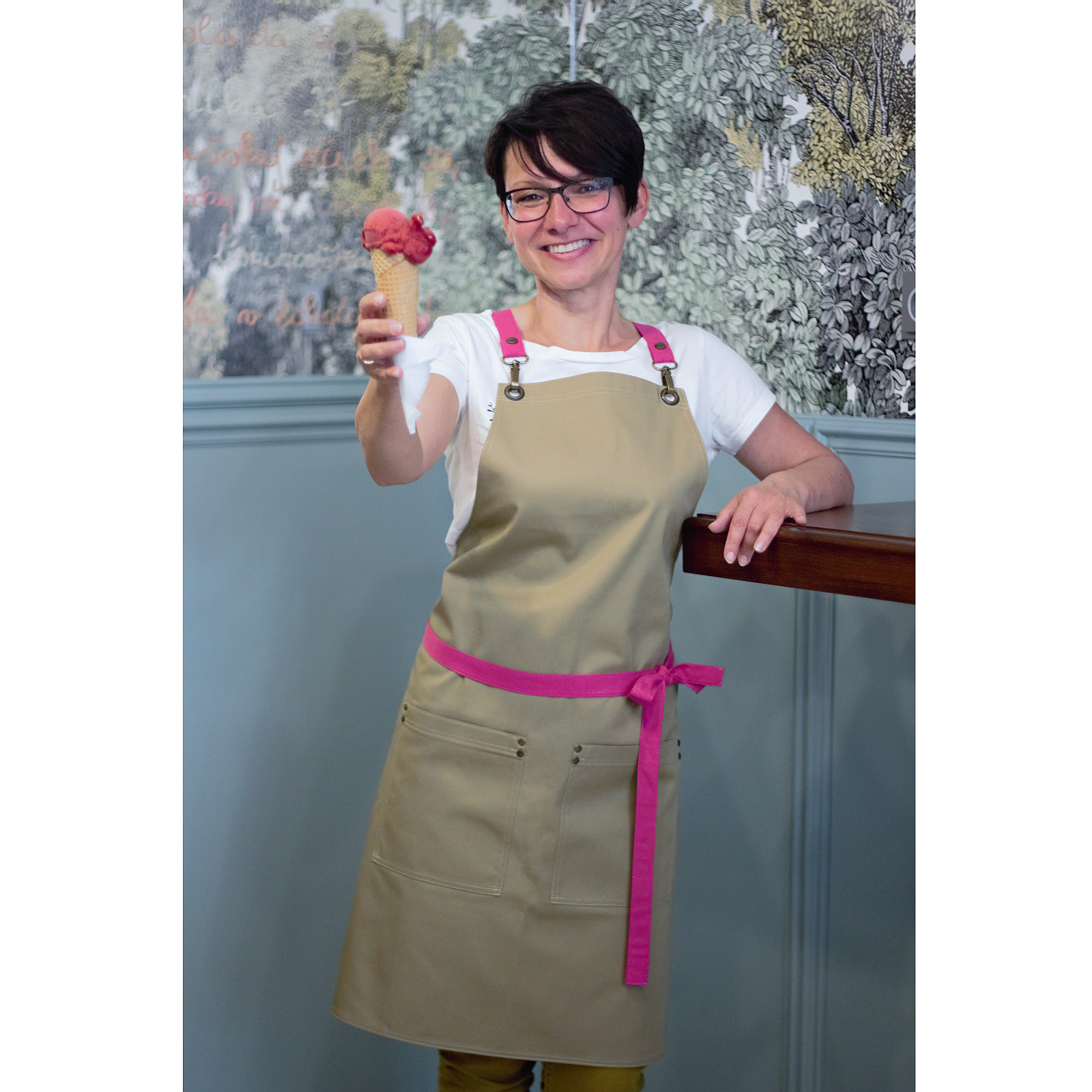 Beautiful and very practical beige apron with detachable carabiners. Choose the color of the straps that will best fits to your business.