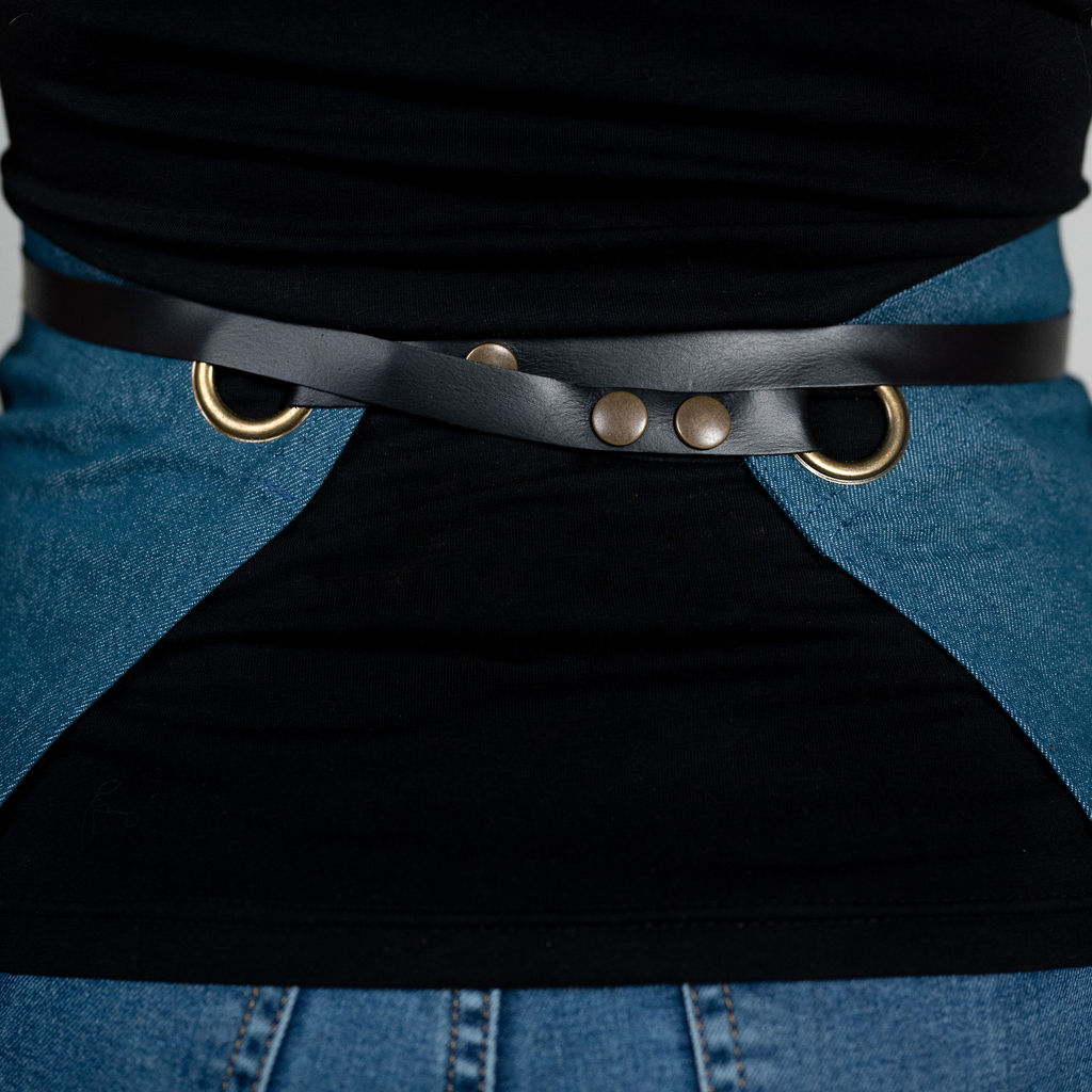 ZÁSTĚRA APRONISTA AXIS denim modrá petrolejová s černým koženým popruhem
