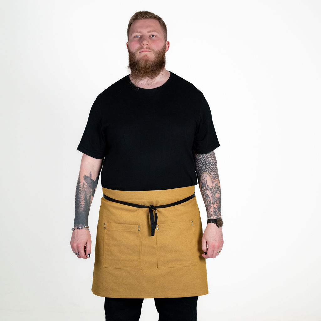 ZÁSTĚRA APRONISTA AXIS hořčicově žlutý denim s černými koženými popruhy