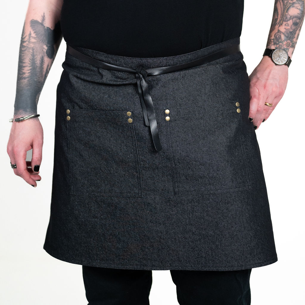 ZÁSTĚRA APRONISTA AXIS černý denim s černými koženými popruhy
