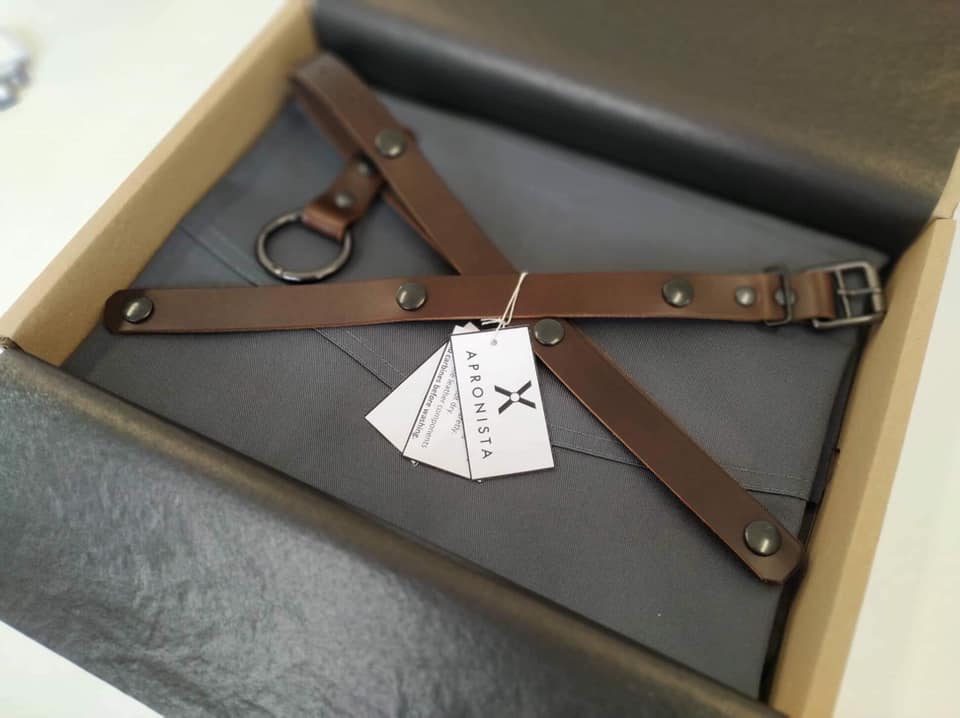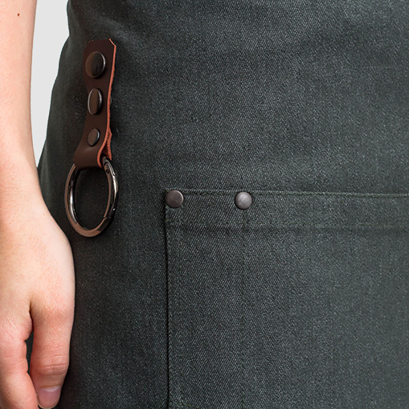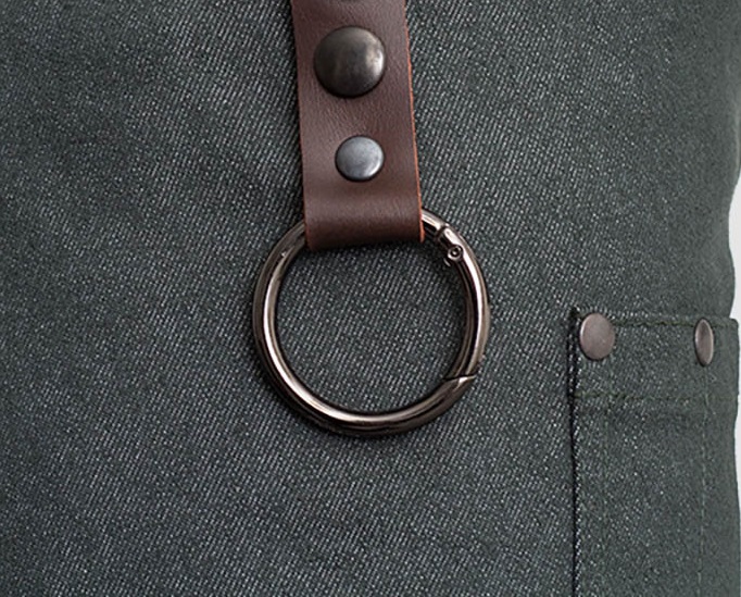 Short apron to the waist with variable fastening to the leather strap. Luxurious look and design. Large practical pocket divided into 4 parts, with ring carabiner on the side. We recommend for service or brigade.